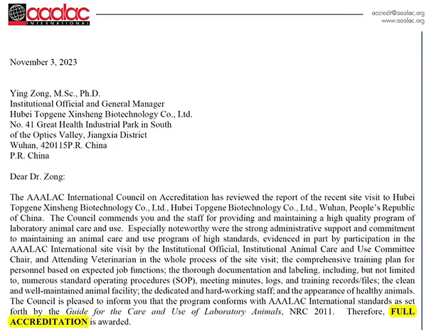 通过国际AAALAC完全认证表明天勤鑫圣实验设施从硬件到软件,从动物福利到环境卫生,从监督管理到体系建设均达到了实验动物管理和研究活动的国际标准。